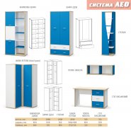 Детская Лео Мебель-Сервис - это современная яркая сочная мебель для мальчишек и девченок. Все модули детской Лео выполнены,  в идущем в ногу со временем, дизайне. Цвет корпуса белый, все крышки и столешница изготовлены в цвете дуб самоа. Фасады как - будто вставлены в рамку из того же цвета дуб самоа. Лео Мебель-Сервис представлена в синем, зеленом и розовом цвете. Вся цветовая раскладка выгдяит очень насыщенно. В нарнтур входят все необходимые предметы: шкафы и стеллажи, комод, кровать и кровать - горка с выдвижным письменным столом, стационарный письменный стол и полка.