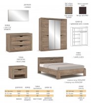 Спальня София Мебель Сервис - это спальня в самых трендовых тенденциях, одной из которых является цвет дуб табако под темную натуральную древесину. Основной цвет разбавлен ручками и вставками в цвете венге. В комплектацию гарнитура входят все необходимые для спальни прдеметы: четырехдверный шкаф, комод, зеркало, кровать, прикроватные тумбочки и зеркало. Шкаф поделен на две половины: одна половина - это полки, вторая половина - плятяное отделение со штангой. Шкаф также оснащен двумя большими зеркалами. Дизайн прикроватных тумбочек также немного отошел от классического. В тумбочке есть одно открытое отделение и одна шухляда. Мебель выглядит довольно массивно и добротно.