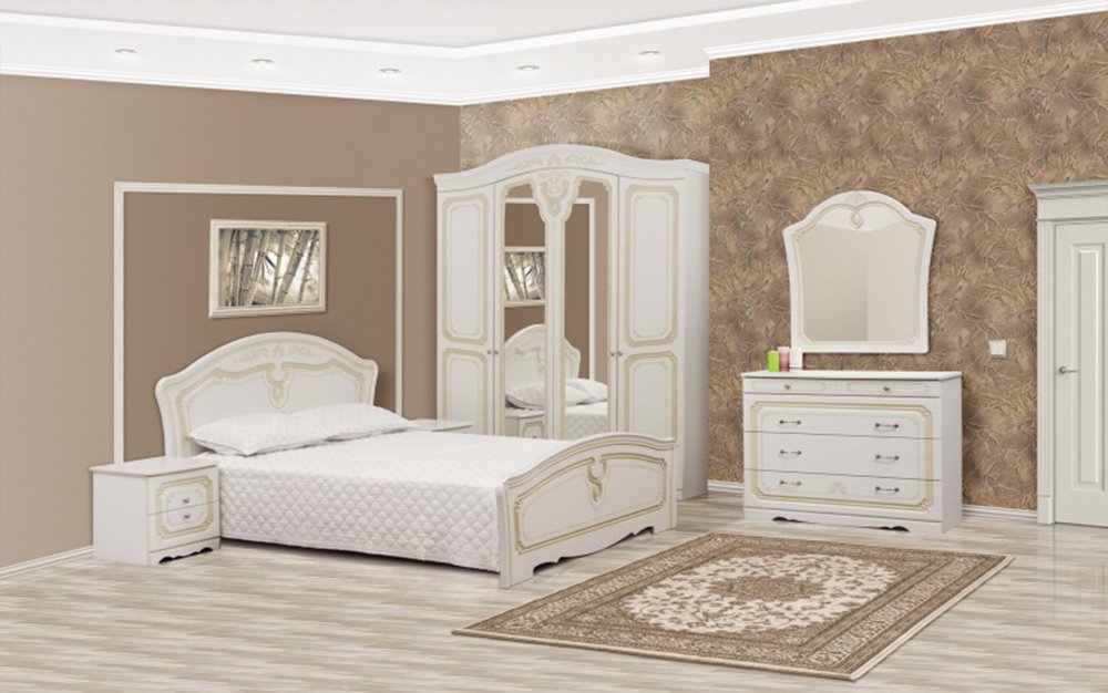 Производитель: Світ меблів Краткое описание: Спальня Луиза белое дерево, патина Цена указана за комплект В комплект входит: прикроватные тумбочки - 2шт, комод, зеркало, кровать 1,6, шкаф 4Д.