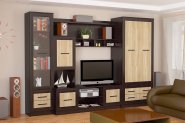 Стенка в гостиную Каспий Мебель Сервис будет отлично смотреться в любом интерьере. Комбинация темного и светлого всегда универсальна и выглядит очень свежо. Темные рамки изящно подчеркивают светлые фасады. Вместе с тем стенка Каспий очень практична в использовании. В комплектацию входит платяной шкаф с ящиками, тумба ТВ, открытые полки, витрина, закрыте ячейки.