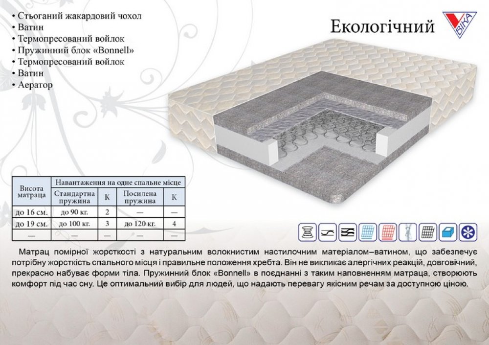 | Екологічний | Стьобаний жакардовий чохол, Ватин, Термопрессований войлок, Пружинний блок «Боннель», Термопрессований войлок, Ватин | 16 | 2149 | 2335 | 2989 | 3410 | 3597 | 4204 |
