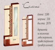 Прихожая Селеста - это один из модулей системы Селеста Мастер Форм . Выполнена интересном дизайнерском стиле и может производится в таких цветовых гаммах: контрастной - венге темный/дуб молочный, теплой - яблоня/дуб молочный. Изюминкой прихожей Селеста является интересная фурнитура, узорное оформление фасадов.