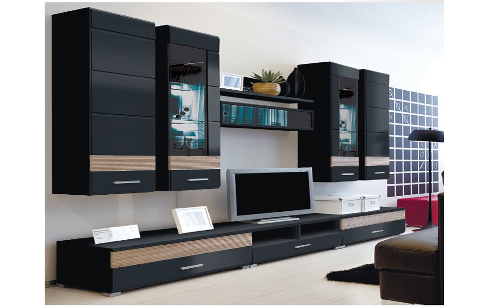 Цена указана за комплект. В комплект входят: тумба ТВ RTV1S/3/10 I - 2шт, тумба ТВ RTV1S/3/10 II, пенал навесной SFW1D/13/4LP - 2шт, витрина навесная SFW1W/13/4 P, витрина навесная SFW1W/13/4 L, полка P/3/10, витрина навесная SFW2W/3/10.