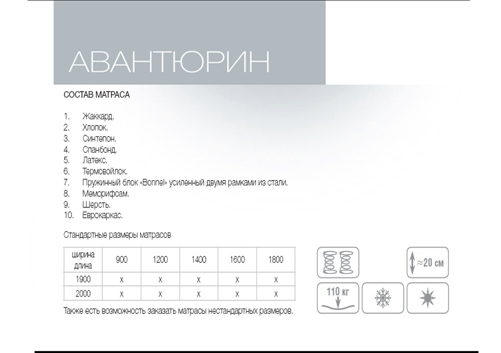 Производитель: Світ меблів Краткое описание: Матрас Авантюрин Свит МебливЦена указана за размер 160*200Жесткость - 3Нагрузка на одно спальное место: 110Высота: 20 |