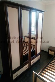 В спальный гарнитур Соня входят двуспальная кровать, прикроватные тумбы, комод, 4-хдверный шкаф и комод. Особо радует наличие в комплекте туалетного столика, оснащенного зеркалом. Интересно в комплекте Соня выполнен шкаф: наличие двух нижних выездных ящиков делает размещение вещей более удобным. А большие зеркала не смогут оставить равнодушными женскую половину.