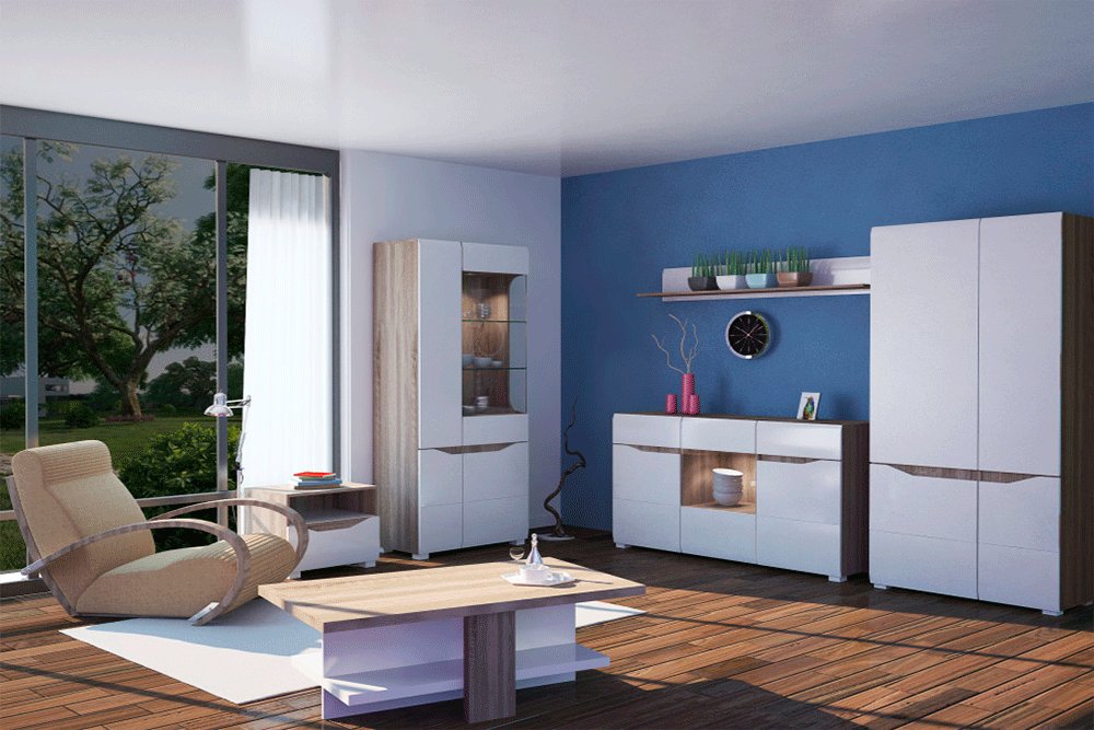 Корпус природного цвета дуб сонома трюфель с вставками неординарной формы такого же цвета отлично сочетаются с белыми глянцевыми фасадами. Дверцы декорированы очень четкими вертикальными разделителями и горизонтальными, не такми выразительными. Стеклянные витрины разработаны в виде окошек.
