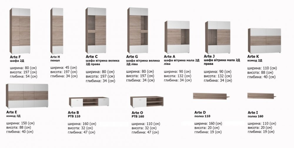 В комплект входит: пенал Arte C, тумба тв Arte O, полка Arte I, тумба Arte J
