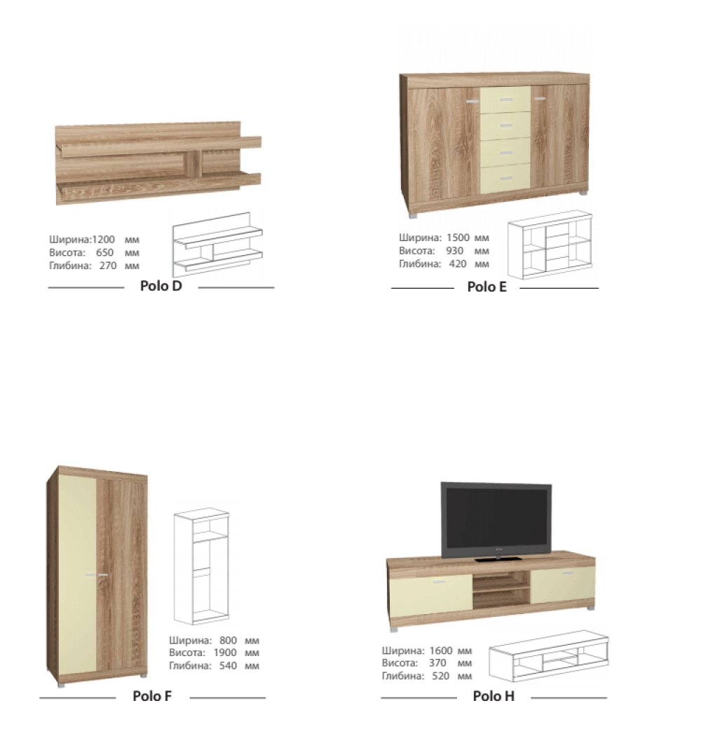 В комплект входит: витрина Polo A, тумба тв Polo B, полка Polo D, шкаф Polo F
