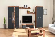 Стенка для гостиной Сакура Блонски поможет внести новизну в Ваше жилье. Цветовая гамма гарнитура очень насыщенная: яркий натуральный цвет слива венгерская скомбинирован с глянцевыми графитовыми фасадами. Дизайн некоторых элементов ассиметричен, что создает некий итерьерный хаос и привлекает внимание. Большое количество открытых элементов, стекол, навесных элементов делает мебель Sakura Blonski практически невесомой.