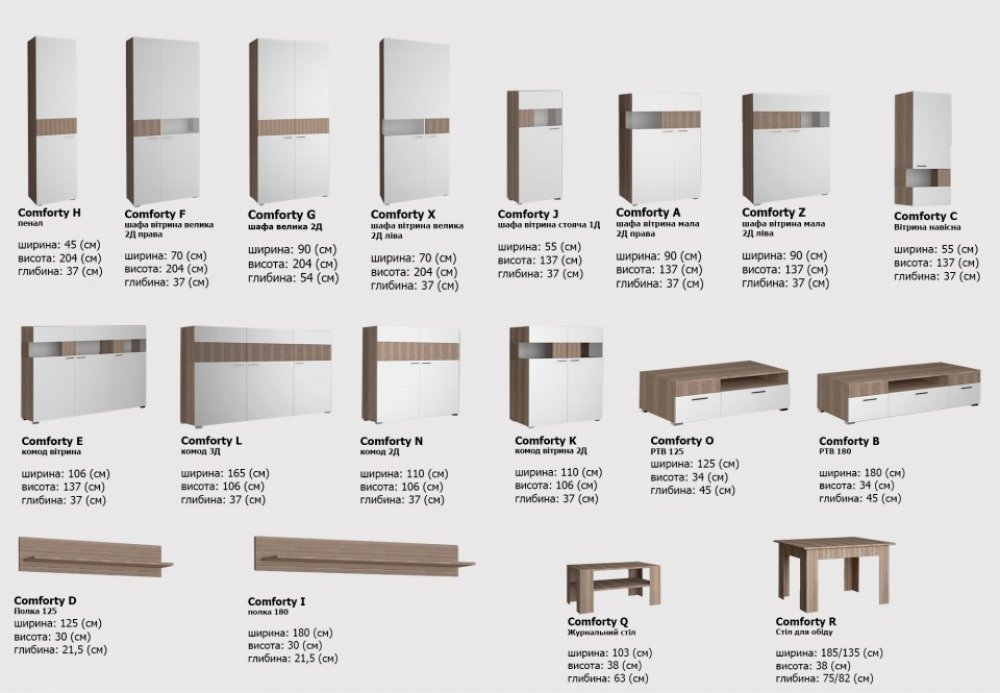 | 12 | Comforty K, комод-витрина 2Д | 110×37×106 | 2477 |