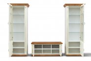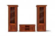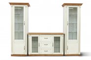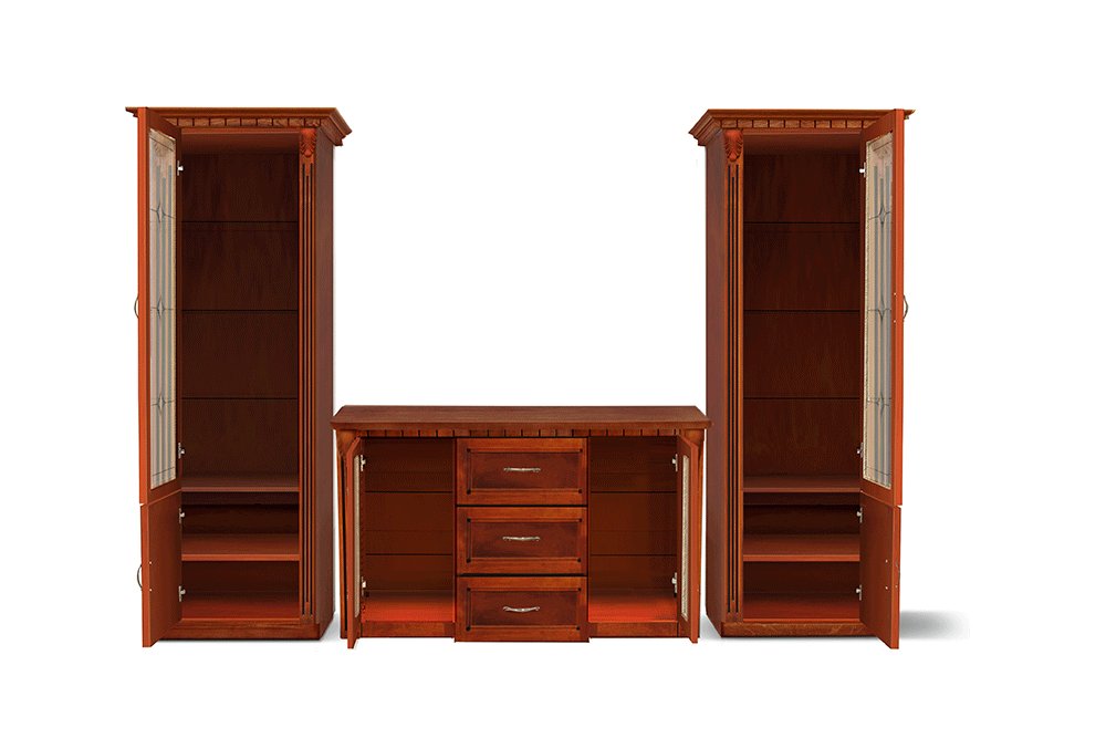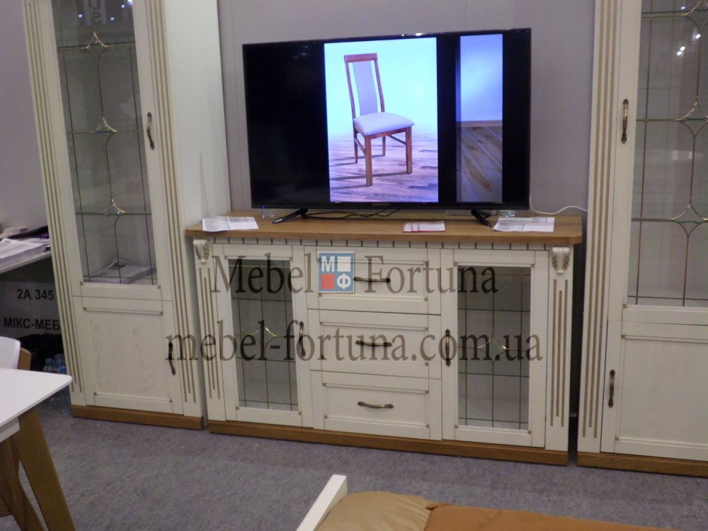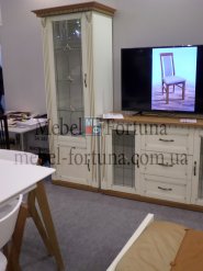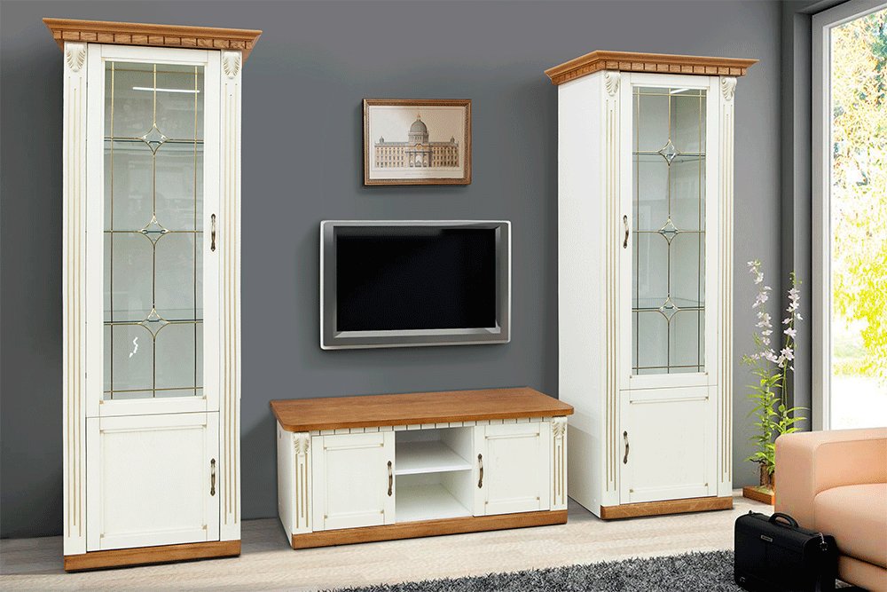 Стенка для гостинной Фридом Миксмебель смотрится неимоверно богато благодаря деревянным фасадам и витражным стеклам. На фасадах нанесена патина, которая придает особого благородства и выразительности. Стенка Фридом производится в двух цветах и в зависимости от цвета используются разные виды древесины: для цвета слоновая кость - дуб, для цвета орех - ольха. В комплектацию гарнитура Фридом входят: пенал, тумба ТВ и два комода на выбор. Также есть набор мебели для спальни.