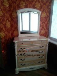 Спальня Роселла Миромарк в цвета радика беж - это настоящее волшебство. Изголовье кровати с ажурной вставкой смотрится очень нежно. Подобный орнамент используется на зеркале и на шкафах. В этом гарнитуре ни одна деталь не упущена из виду. Прикроватные тумбы и комод смотрятся просто великолепно и выполнены в одном стиле: декоратиные колонны по бокам, ножки-лапы, орнамент на фасадах, верхний ящичек узенький, а остальные - стандартные. Наличие трех шухлядок в тубочках - это большая редкость.