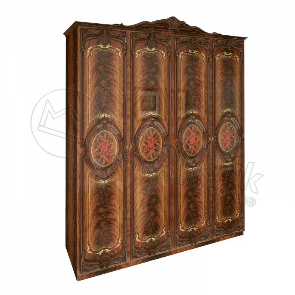 Спальня Реджина Миромарк - это находка для ценителей декора, позолоты, богатого убранства. Каждый элемент украшен объемными элементами, обрамлениями, медальонами, рамочными фасадами, цветочным рисунком, коронами, ажурными накладками или вставками. Все вместе составляет гармоничный ансамбль великолепия.