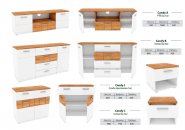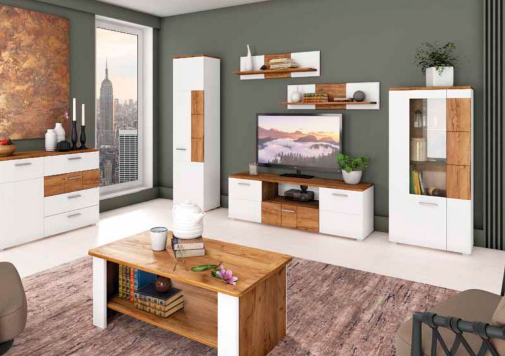 Мебель для гостиной Candy Blonski (Канди Блонски) - еще одна из систем, в которой очень удачно сочетаются белый матовый цвет и натуральный оттенок. Теплый цвет крафт табако матовый подчеркивает снежную белизну основного полотна. Большое количество разнообразных предметов практично и со вкусом обставят Вашу гостиную, спальню, кабинет или столовую. Еще одной изюминкой гарнитура являются металлические ручки и геометрические вставками с четкими линиями