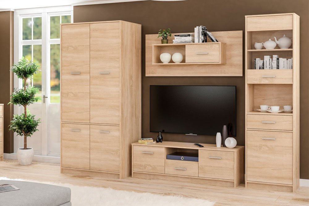 Цена указана за комплект: шкаф 4Д, тумба навесная, тумба ТВ 2Д1Ш, витрина 1Д1В1Ш