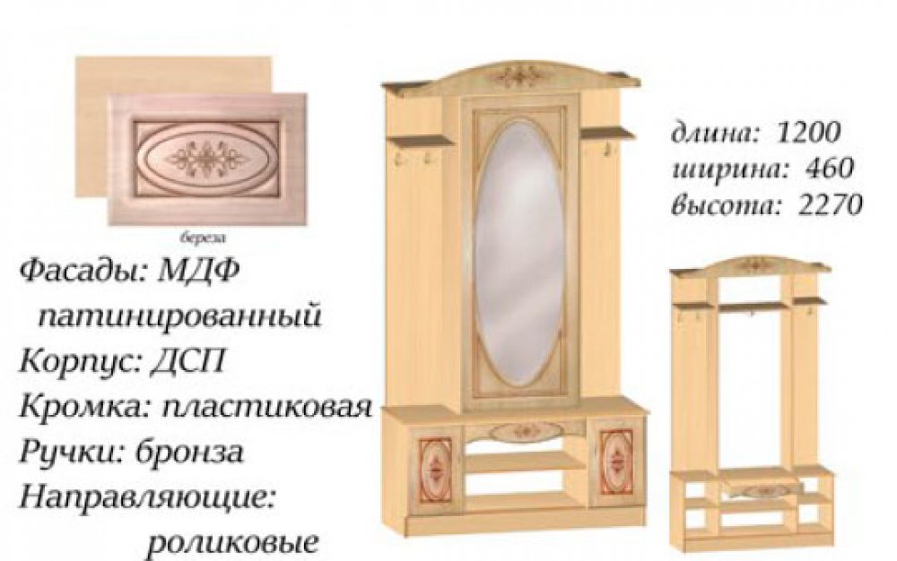 Прихожая Василиса Мастер Форм - это еще один предмет из огромной модульной системы Василиса береза. Прихожая смотрится также богато и роскошно как и остальные элементы: благородный цвет береза, патинированные фасады, много декора. Прихожая оснащена огромным овальным зеркалом на двери глухого отделения, есть маленькие закрытые отделения, есть подставка для обуви и просто вешалки для верхней одежды.