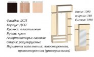 Производитель: Мастер Форм Краткое описание: Прихожая Лего Длина: 1090 Высота: 1990 Ширина: 340 Много вариантов расцветок |