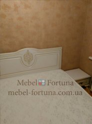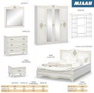 Спальня Милан Мебель Сервис - это нежный легкий изысканный гарнитур. Мебель выполнена в белом цвете с патинированными фасадами. Комод, кровать и тумбочки стоят на высоких ножках и это делает спальню более утонченной. Кровать имеет довольно высокое изголовье, украшенное орнаментом, который грамонично сочетается с таким же орнаментом на шкафу.