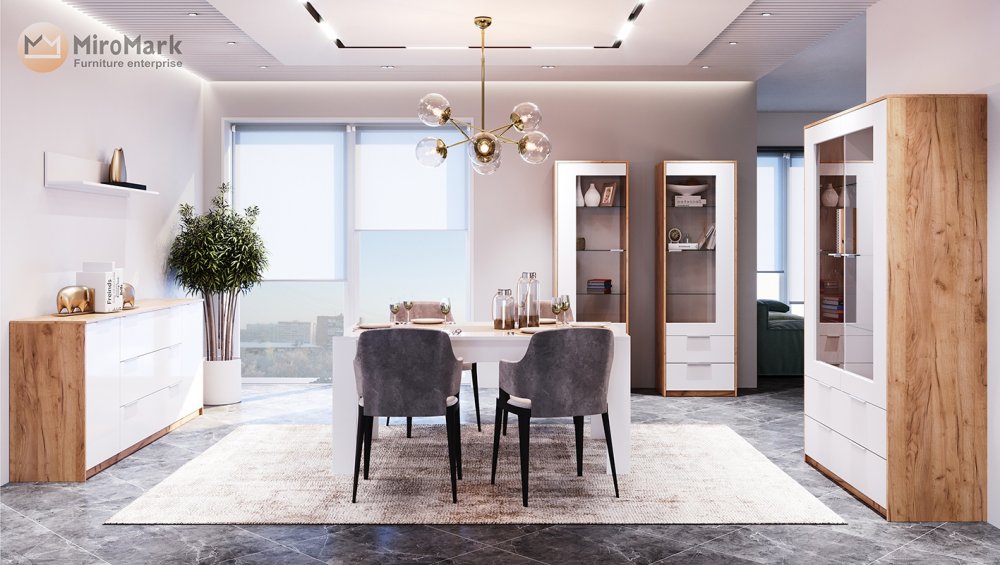 Современная стенка в гостиную Асти Миромарк - это ультрасвоременная мебель в цвете дуб крафт/белый глянец. Дуб крафт максимально приближен к натуральному оттенку, а белый глянец очень органично его разбавляет и подчеркивает природность цвета. В комплектацию гарнитура Асти входит большое количество предметов для меблировки гостиной, кабинета, столовой: серванты, комоды, столы. Все модули смотрятся легко, так как цветовая гамма светлая, много стекла, открытых ячеек. По желанию серванты могут докомплектоваться подсветкой.