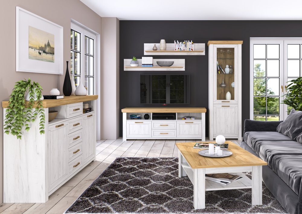 В комплект входит: витрина 1В1Д SUDBURY A, тумба ТВ 2Д2Ш SUDBURY B, полка 130 I - 2шт.