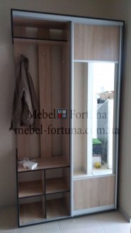 Купить прихожую-купе Бриз Миксмебель. Очень часто в коридоре есть необходимость установить не стандартную прихожую или обычный шкаф-купе, а именно прихожую-купе. Дверца скроет верхнюю одежду и коробки с обувью, а открытая часть оснащена вешалками, ячейками для обуви и полкой для размещени сумок, перчаток и остальных мелочей. Дверца декорирована зеркалом в обрамлении ДСП основного цвета. Прихожая смотрится очень стильно и элегантно.
