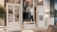 Модульная система Кантри – представитель коллекции именно наборных стенок. Приобрести мебель Кантри Вы можете комплектом как на картинке или же подобрать самостоятельно из отдельных предметов. В системе Кантри присутствует также односпальная кровать и прикроватная тумбочка. Комоды представлены на выбор угловой или очень вместительный. В комплект гарнитура можно включить письменный стол, настенное зеркало, прихожую, а также тумбу под телевизор с местом для техники и дисков. Представлены витрины в трех размерах с одним, двумя и тремя фасадами.