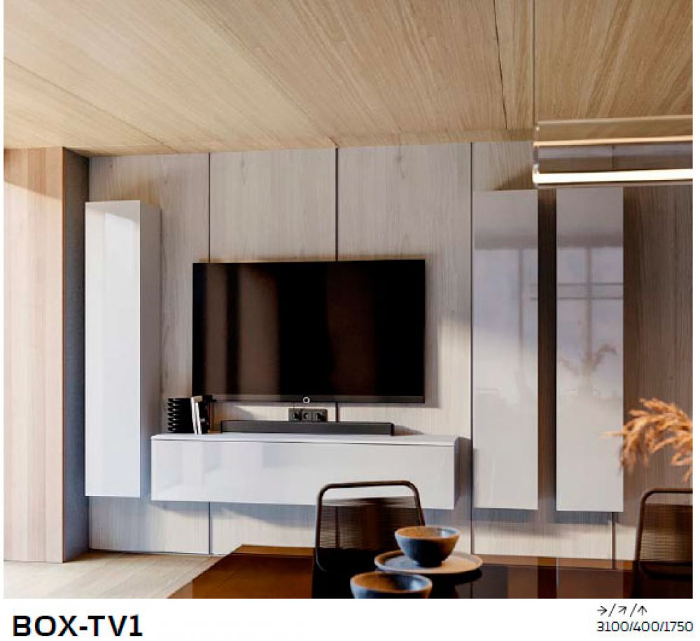 Все стенки Бокс разделены на несколько коллекций. Коллекция с буквосочетанием TV в названии имеет ряд отличий. В комплектацию стенок из этой коллекции входят либо вертикальные высокие шкафы, либо открытые полки. Каждая из этих компоновок оригинальна и никого не оставит равнодушным. Ценители такого стиля найдут это мебели достойное применение.