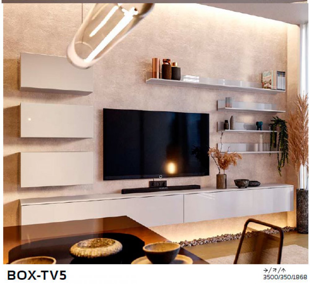 Все стенки Бокс разделены на несколько коллекций. Коллекция с буквосочетанием TV в названии имеет ряд отличий. В комплектацию стенок из этой коллекции входят либо вертикальные высокие шкафы, либо открытые полки. Каждая из этих компоновок оригинальна и никого не оставит равнодушным. Ценители такого стиля найдут это мебели достойное применение.