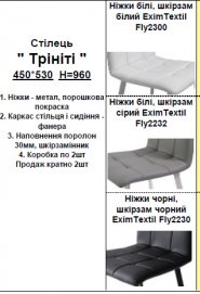 Еще один стул с металлическим каркасом - это Тринити. Ножки у стула довольно массивыне, спинка и сиденье являют собой единую конструкцию. Наполнение стула поролон, а обивка кожзам декорированный раздлеителями. Благодаря этому стул смахивает скорее на кухонное кресло, чем на стул в классическом понимании. Есть несколько цветовых вариантов этого стула. Стул Тринити прекрасно гармонирует со столами из этой же коллекции.