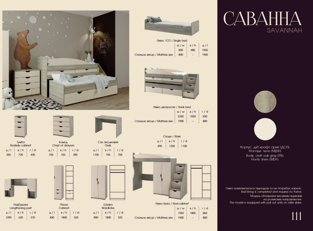 Производитель: Світ меблів Краткое описание: Двухъярусная кровать Савана Ширина:1942 Высота:1320 Глубина:1100 Спальное место 1900*800 В комплектацию не входит стол, тумба, надставка и ступени-комод |