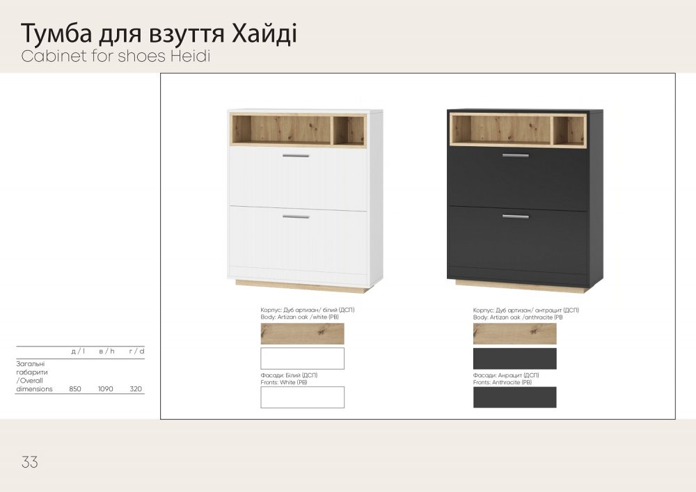 Производитель: Світ меблів Краткое описание: Тумба под обувь Хайди СМ Ширина 850 Висота 1090 Глубина 320 |