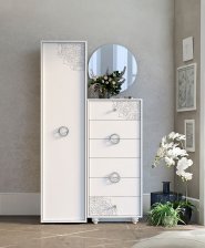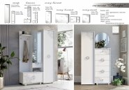Мебель Нимфа Мастер Форм олицетворяет собой нежность, весну, невесомость. Цвет системы - нимфея альба с ненавязчивым нанесением патины. Ножки округлые, витиеватой формы и несут скорее декоративную функцию. Круглые большие, пустые посредине, ручки дополняют общий ансамбль. Но кроме красоты мебель является полностью функциональной. Шкаф имеет платяное отделение и пару полок в середине. Сама прихожая оснащена полками за зеркальным фасадом, крючками, закрытыми отделениями в нижней тумбе и полкой для головных уборов. Кроме того в систему Нимфа входит несколько разновидностей комодов.