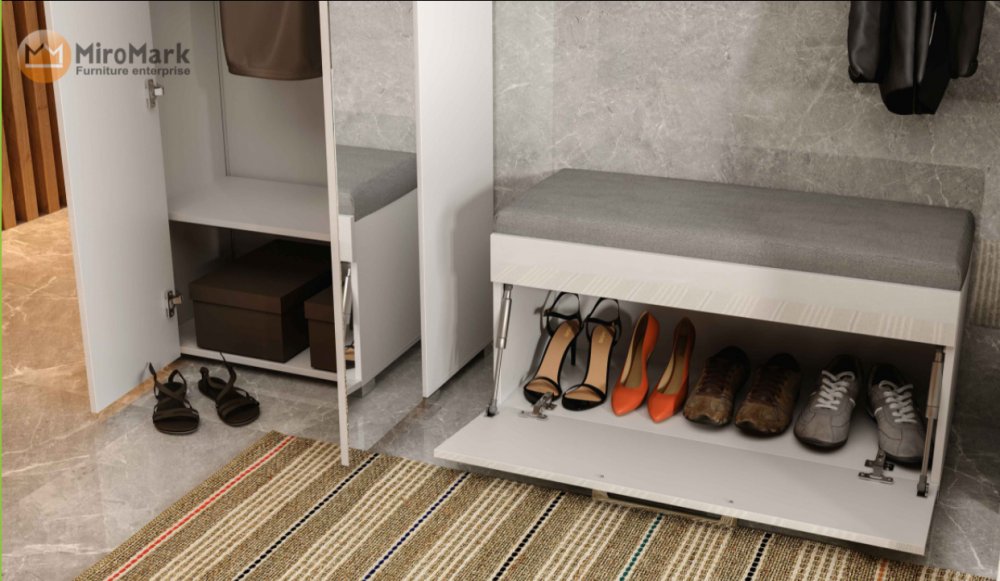 Прихожая Аманда Миромарк - это настоящая находка для любителей белой глянцевой мебели. В комплект входят зеркало, вешкалка, двухдверный шкаф, тумба для обуви и комод. Тумба по желанию может комплектоваться мягким сидением. Гарнитур выполнен в стиле минимализм в лаконичном дизайнерском решении. Сама по себе прихожая малогабаритная, но при этом очень вместительная и функциональная. В прихожей Аманда довольно много приятных изюминок: разделение комода на отделение с ящиками и дверцами, ниша для хранения в тумбе-лавочке, зеркало-двери в шкафу. Все это вместе взятое создает идеальную прихожую.