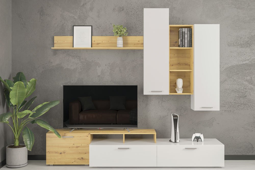 Купить мини-стенку недорого Лора Свит Меблив. Это просто находка для любителей стиля минимализм. Мини-стенка Лора выполнена в цветовой гамме дуб крафт золотой и белый. Изюминкой этой горки является ассиметрия. В комплект гарнитура входят тумба ТВ, полка, навесные шкафчики с дверцами и без. Горка Лора Свит Меблив выглядит очень легко и практически невесомо. Благодаря небольшим габаритам найдет свое место практически в любом помещении.
