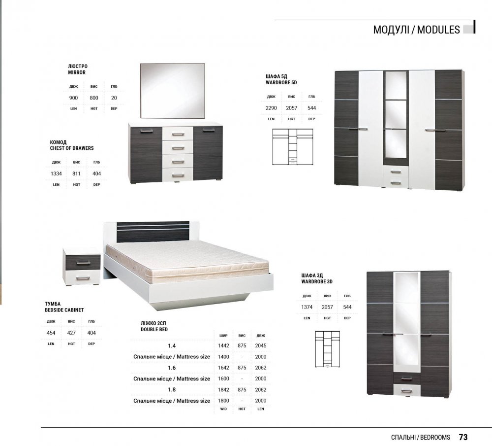 Производитель: Світ меблів Краткое описание: Грань, линия, порядокЦена указана за комплект. В комплект входит: прикроватные тумбочки - 2шт, комод, зеркало, кровать 1,6, шкаф 3-Д (на фото шкаф 5-Д)